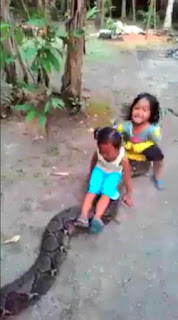 Las siguientes fotografías muestran a las dos niñas riéndose mientras montan a la serpiente gigante, que los usuarios creen que es una pitón reticulada, una de las más largas y pesadas del mundo.