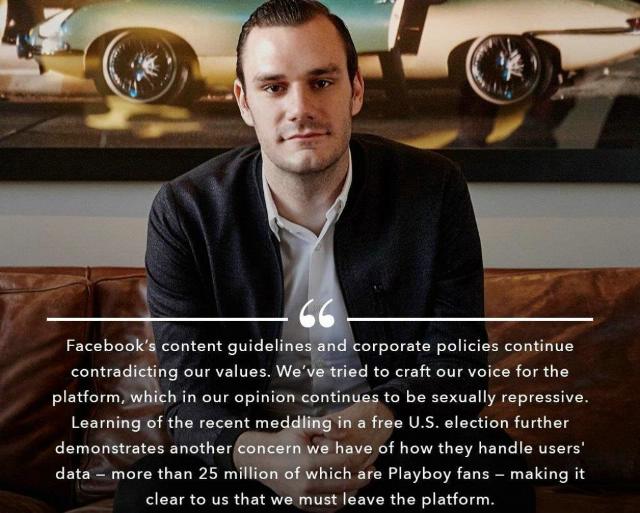 En una publicación en Twitter que anunciaba la decisión de alejarse de Facebook, el director creativo Cooper Hefner también describió la plataforma de medios sociales más grande del mundo como «sexualmente represiva».