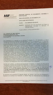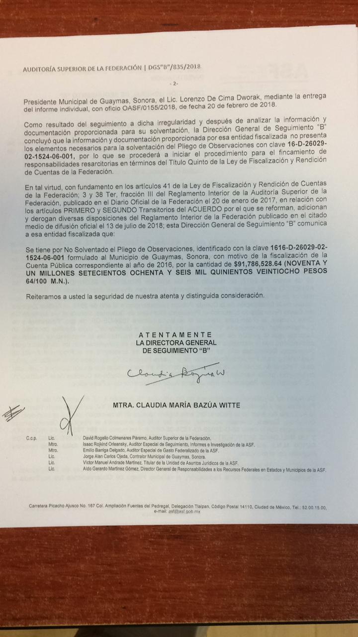 Mediante oficio DGS “B” /835/2018, emitido en la Ciudad de México, el 5 de octubre reciente, dirigido al ex presidente Lorenzo de Cima, el órgano técnico de fiscalización notificó de “la NO solventación del Pliego de Observaciones formulado al Municipio de Guaymas”.